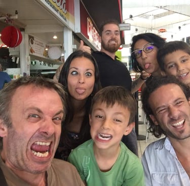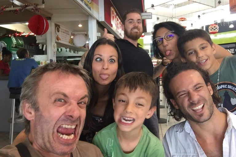 De gauche à droite : Pierrot, Corinne, Rémy (en noir), Romain (en vert), Anne-So, Emmanuel (en kaki) et moi (en joie).