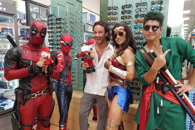 Les premiers clients se font attendre sans impatience de ma part et c’est plutôt l’effervescence de la galerie marchande qui m’intéresse. Les animations battent bientôt leur plein à nouveau et, ô surprise !, ce sont maintenant des cosplayers qui attirent l’attention des jeunes de tous les âges ! Une douzaine de vrais faux personnages de jeux vidéo, de dessins-animés, de films ou de bandes-dessinées passent, repassent et se promènent ce matin dans leurs fantastiques costumes, la plupart faits maison. Ici, un minuscule bambin vêtu d’un t-shirt Batman serre dans ses bras tout fins la jambe d’un Pikachu jaune électrique de deux mètres de haut ; là, une petite fille aux yeux humides d’admiration trépigne d’envie d’aller parler à Wonder Woman, la vraie de vrai évidemment, qui rapidement arrive d’elle-même ; et (suis-je le seul à l’avoir aperçu ?) le très cynique et absurde Deadpool, dans sa tenue de combat intégrale en cuir noir et rouge, robuste et virile, fait du lèche-vitrine devant la boutique de sous-vêtements féminins. Ce n’est plus un centre commercial ici en cet instant, c’est le festival du sourire !