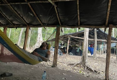 C’était très probablement lui qui avait effrayé les canassons en se pointant par surprise. Je ne sais pas quel sorte de bruit j’ai fait en le voyant mais je l’ai surpris à son tour et il m'a repéré, direct. Je ferais un très mauvais ninja de la jungle. Il m’a regardé. Je l’ai regardé. Il m’a regardé. Il m’a fait un signe de la patte, le pouce en l’air, un clin d’œil aussi, puis il a trottiné tranquillement en direction du coin cuisine d'où il a descendu un petit tas de branches, a escaladé facilement un morceau de tronc afin de progresser sur les trois planches inégales qui constituaient notre longue table à manger, le tout avec une agilité et une détermination qui laissaient supposer qu’il connaissait déjà très bien le camp. Peut-être même qu’il connaissait déjà Marta, notre muletière/cuisinière, ou qu’elle le connaissait, car elle a à peine levé les yeux pour lui jeter nonchalamment au loin un bout de tortilla trop cuite. Je ne crois pas avoir lu quoi que ce soit à propos de tortillas dans Pedro le Coati mais les galettes de maïs de Marta avaient l’air faciles à chasser alors je comprends.
