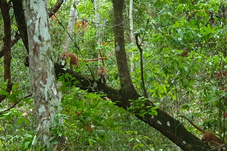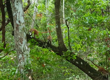 QUOI ? Comment ça, JUSTE un coati ? C’est comme ça que j’apprends qu’on a des chances d’en voir ? Mais c’est une info à publier dans la presse tellement qu’elle est super chouette ! Linsa n’a pas eu le temps de me préciser qu’aucune Super-Chouette n’habitait dans le coin avant que je ne lui demande la confirmation que oui, on allait très certainement voir des groupes de coatis roux (nasua nasua) en pénétrant plus avant dans la jungle. J’aurais voulu qu’on se mette tous à trotter tant cette nouvelle me rendait impatient.
