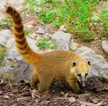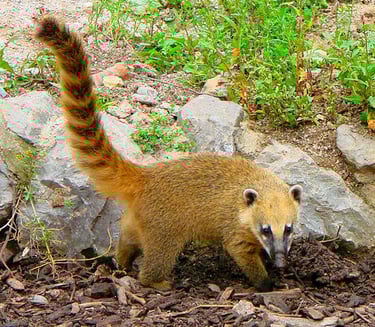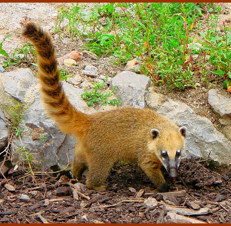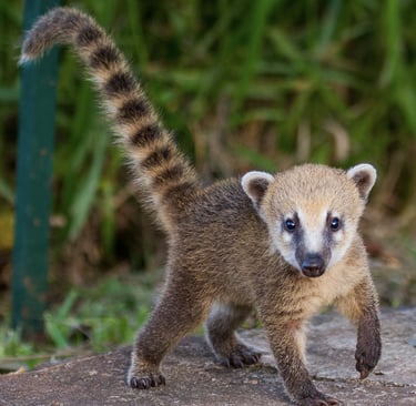 Voilà bien un animal injustement méconnu ! En Europe en tout cas, car en Amériques Centrale et Sudale, où il vit en bande dans la forêt, le coati n’est pas du genre à se cacher. Peut-être parce qu’il est un redoutable prédateur invincible (spoiler alert : non) ou peut-être parce qu’en cas de menace, l’agilité de ce mammifère lui permet de fuir rapidement dans les hauteurs des arbres à la manière d’un écureuil. Un grand écureuil, qui aurait bien mangé à la cantine. Imagine un raton-laveur ou un panda roux croisé avec un opossum qui aurait une longue queue touffue annelée. Ajoute un sifflement en guise de cri, saupoudre d’une bonne poignée de mignonnerie et tu sauras à peu près à quoi t’y tenir (ok, d'accord, les jeux de mots sonores à l’écrit, je vais me retenir).