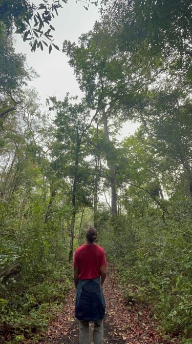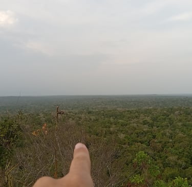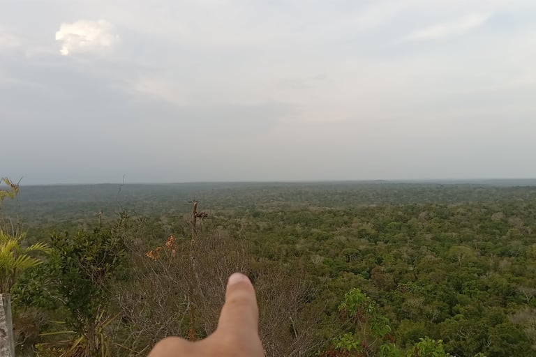 La journée du lendemain était consacrée à l’exploration des différents sites alentours. Temples, routes, stèles, réservoir d’eau, maisons, sépultures, bains de vapeur, local à poubelle, parc de stationnement, tabac-presse du Balto... Une ville immense avait existé sous nos pieds dont une faible proportion seulement restait émergée. Les estimations de sa population sont de l’ordre du million d’habitants à l'apogée et les raisons de son abandon sont encore à l’état de théorie. Chaque relief alentours cache potentiellement une structure de pierres taillées ensevelie sous des siècles de végétation libre. En prenant de la hauteur, par exemple en allant observer l’autel sacrificiel où de nombreuses vies ont dû être offertes à Chaac, dieu de la pluie, ou à Ixchel, déesse de la Lune, on réalise par le nombre de portions bombées dans la forêt à quel point la cité devait être étendue. En pointant l’index vers l’une d’elles, Linsa nous explique que la frontière avec le Mexique est devant nous, à portée de regard et de marche, qu’elle passe entre la butte avec le gros arbre penché et la grosse un peu carrée ; tout ce qu’on peut distinguer, nous, c’est l’immensité passée de la civilisation maya et celle de la nature qui reprend sa place, inéluctablement.