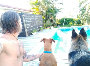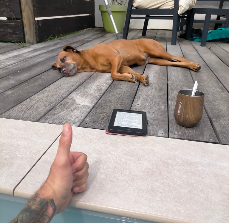 Mon rituel du matin y est devenu ce temps dans la piscine, parfois à lire, parfois à siroter un café, parfois à m’asseoir au fond en apnée sous la surveillance inquiète de la chienne Poupette. Une seule fois j’ai envisagé de tout faire en même temps, mais elle avait levé les yeux au ciel si haut et poussé un soupir si profond que je m'étais résigné avant que le café ne finisse de me faire réaliser ma bêtise. Profiter de ce bain d’eau claire est une façon plutôt très très agréable de commencer mes journées ! Et puisqu’ici c’est l’été, l’entrée dans l’eau que le soleil maintient très très facilement à plus de 30°C est plutôt très très agréable aussi.