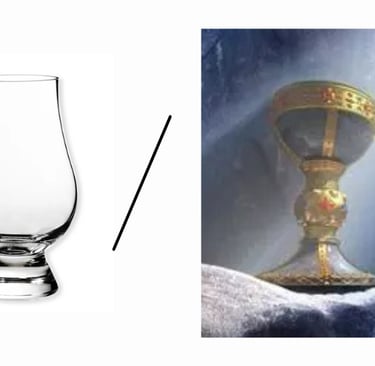 Illustration comparative entre un verre à whisky de chez Glencairn Crystal, avec sa forme caractéristique en tulipe, et ma bonne vieille timbale que j'ai depuis près de 2000 ans.