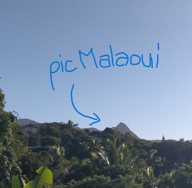 Ce matin je lisais, assis dans une bouée avec ma tasse sur la margelle, quand j’ai bloqué, comme je te le disais, sur la vue. Avec au loin le Pic Malaoui, donc, qui me rappelait mes séjours précédents et les années de vie que leur cumul représente. Au fond du jardin les cocos verts tombés de leur cocotier et dont j’ai bu l’eau douce et acidulée quelques jours auparavant ont été dispersés sur la pelouse, étalés au gré des machouillages des chiennes. Elles sont étalées sur le sol elles aussi, les adorables Seidi et Poupette, dont j’ai la garde ou qui me gardent je ne sais plus. Postée comme trônant sur l’immense table ronde de la terrasse, une bobine de chantier recyclée d'environ 2 m de diamètre, Chat-Pigeon regarde fixement une proie potentielle dans le grand manguier : un oiseau ? Un lézard ? Une feuille ? Ça peut tout être, du moment que ça bouge. Un lézard, d’ailleurs, j’en vois un juste devant moi qui se laisse cuire sur des graviers : ici, comme en Polynésie-Française, à la Réunion ou en Guyane, on les appelle des margouillats. Ailleurs, le plus souvent, on les appelle des geckos. Dans Le Robert on les appelle Hemidactylus frenatus. De ma bouée, je l’appelle « psst, pssstt ! » sans trop de résultat.