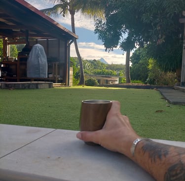 À côté je vois ma timbale, que je m’étais offerte à Hawaii. Une tasse d’alu au fond bombé dont la forme rappelle celle des verres Glencairn, que les amateurs de scotch whisky apprécient pour la concentration des arômes qu’ils permettent au nez. Mais qui ne servent généralement pas à boire aussi du horchata au Guatemala, du barraquito aux Canaries ni du kava au Vanuatu. Le revêtement d’imitation bois de cette tasse commence seulement à s’écailler après sept ans d’usage quotidien, même en trek, même en ré-soi, même en bivouac en forêt ou sur un îlot. Ça commence à faire un bail que je trimballe cette timbale à deux balles, costaud ce beau p’tit pot.