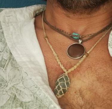 Autour du cou je porte d’autres bijoux d’autres pays. Un collier du Nicaragua, une turquoise pas chère pour un souvenir précieux. Une aigue marine offerte par un frangin en Nouvelle-Zélande aussi. Ainsi qu’un véritable morceau de bois d’arbre végétal de France.